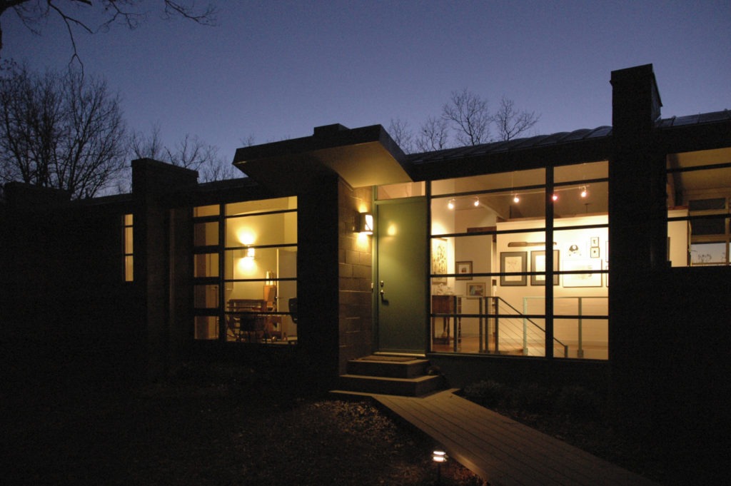 This new house built on a 3 acre mountain site in Brevard, North Carolina, was sited with gorgeous views of the Blue Ridge Mountains to the Northwest. The house was designed to fit into the steep slope of the site, with polished concrete masonry piers that spring out of the precarious terrain to support the curved laminated wood beams that carry the barrel vaulted structural insulated panels of the roof. The design utilizes large 8 foot tall by 12 foot wide sliding glass doors to maximize the views between the piers – each opening out onto a continuous balcony/deck. The house was designed for a retired couple with a master suite on the main floor and two guest rooms with a family room on the lower level along with the two car garage. The cantilevered ends of the main floor of the house are clad in a diamond shaped zinc metal panels.